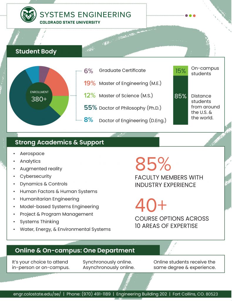 Colorado State University’s Department of Systems Engineering uses systems-thinking to solve the world’s most complex problems. We offer accessible graduate education in-person or online with over 40 course options. Our five programs include certificates, MS, ME, PhD, and the Doctorate of Engineering in Systems Engineering.